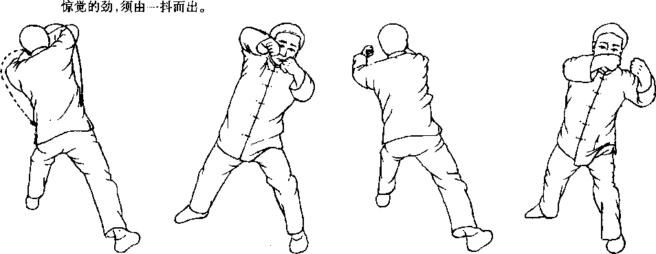 2.此势所发之劲,运用的是抖劲,抖劲是短距离的携劲的一种。抖劲,须表现出有如在皮肤上着了火星那样一种