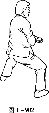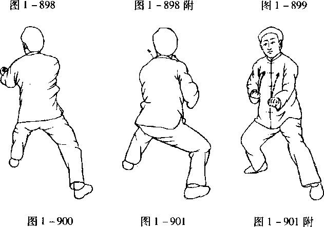 口令2 (图1 -898至901) 身体稍右转,重心右移,同时双拳内旋向下划弧收于腹前。