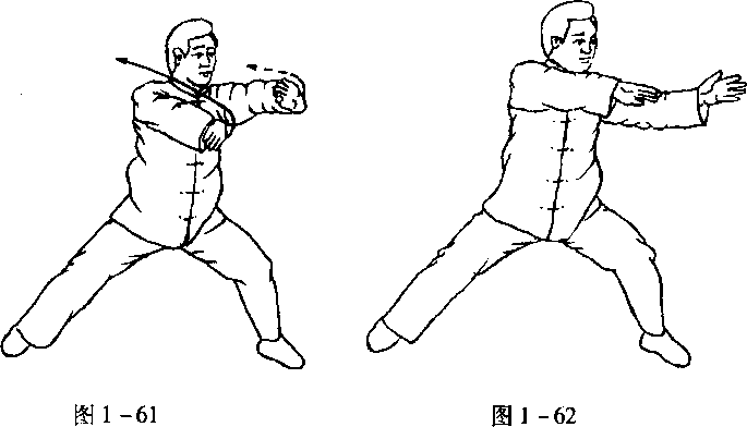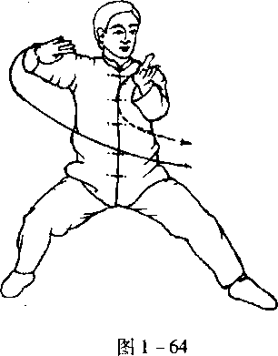 口令2(图1 -63、64) 身体右转,重心右移,同时左手内旋,右手外旋,向上划弧运至身