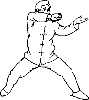 右脚震脚落地,同时,右拳落于左掌心,重心不变(面向东)。