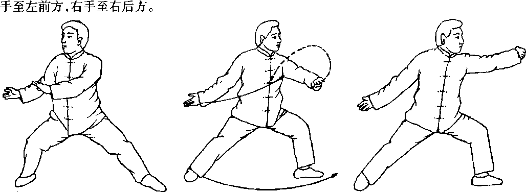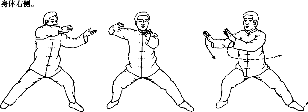 身体右转,重心右移,同时左手内旋,右手外旋,向上划弧运至