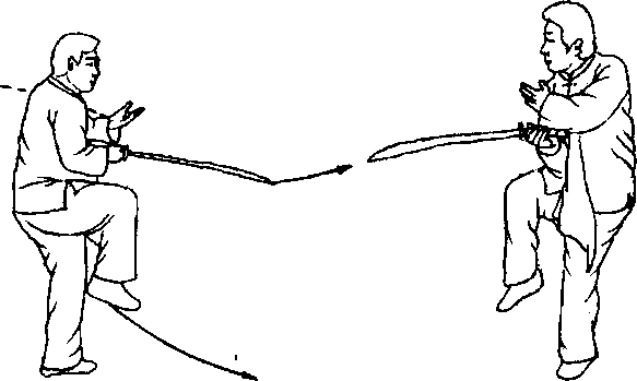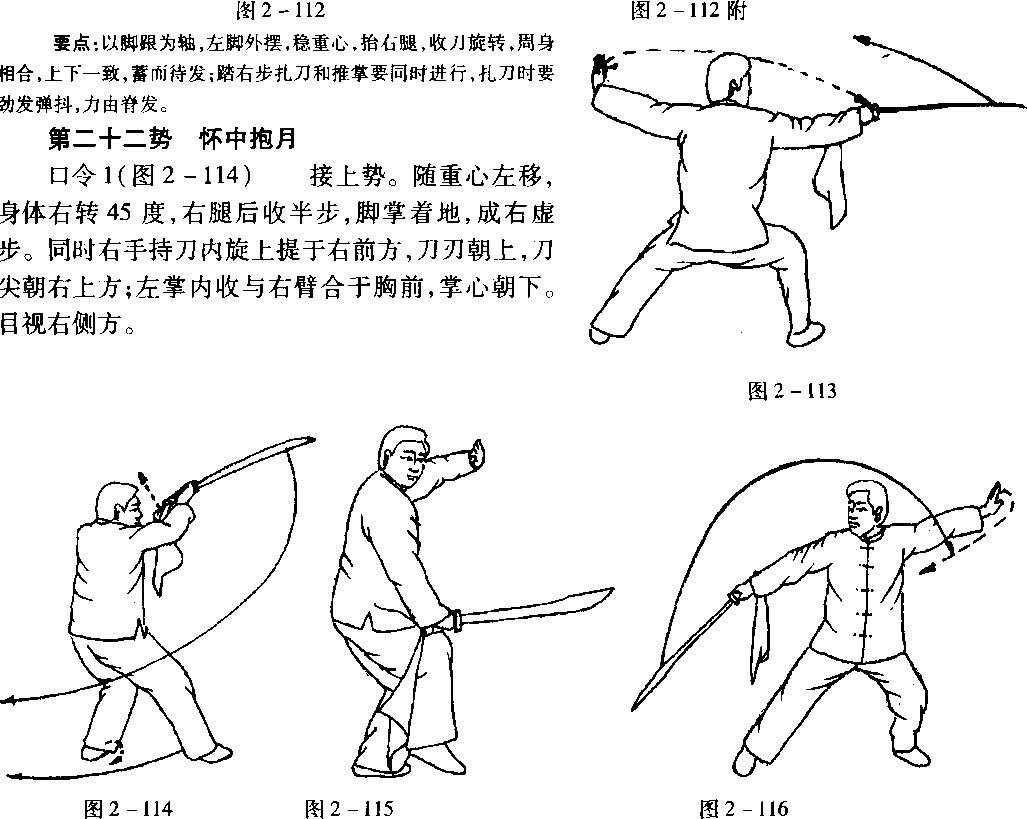 口令1(图2-112) 接上势。左脚尖外摆,抬右腿成左独立步,同时右手持刀内旋与左
