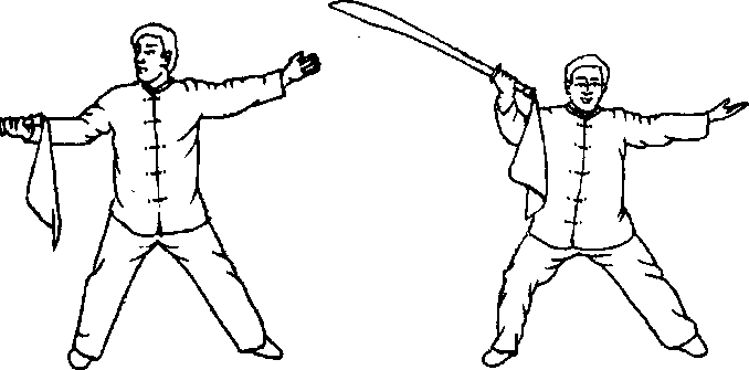 口令4(图2 -120) 右手将刀柄交于左手中,两手随即由胸前向下分至两侧,右手心朝