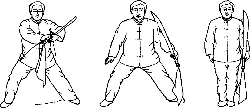 后,左手抱刀,刀尖朝上,刀刃朝前。目视前方。