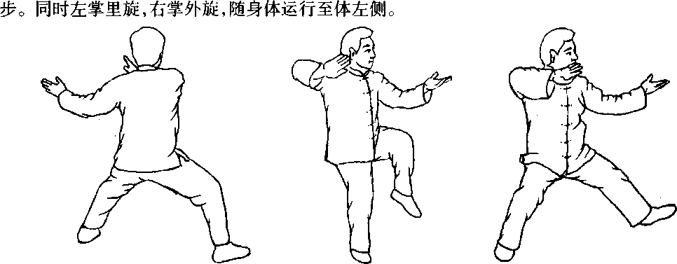 口令1(图1 -129、130) 身体微左转,左掌外旋,右掌内旋,向左运行至身体左侧。
