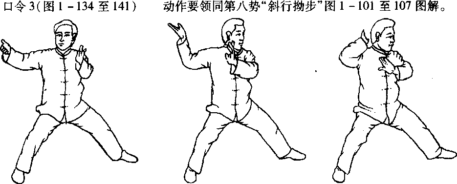 口令2(图1 -131J32J33) 身体右转,重心移至右腿,收左腿并向左前方45度开一大