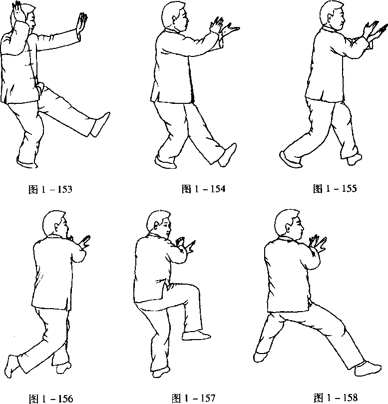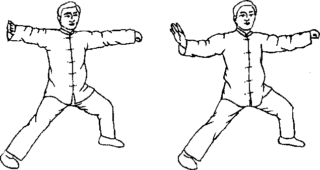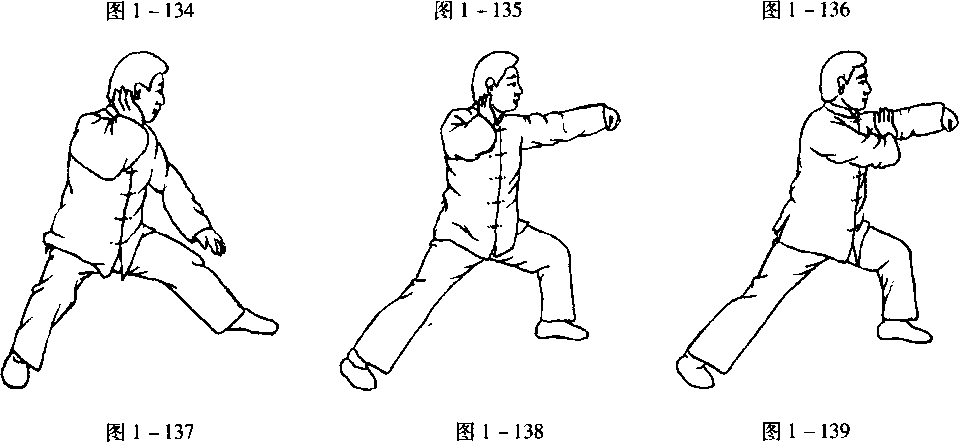 2.此势震右脚与发右拳,要表现出太极拳的刚劲。太极拳的运劲与发劲是并重的,以达到刚柔相济和灵活转换。