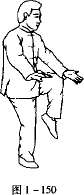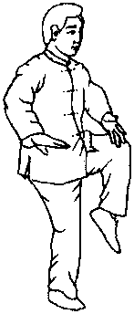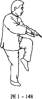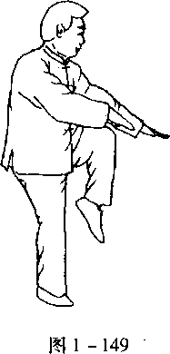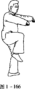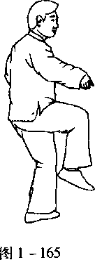 口令2(图1 -165J66J67) 身体右转,重心移至左腿,右腿屈膝提起。同时左掌右拳合