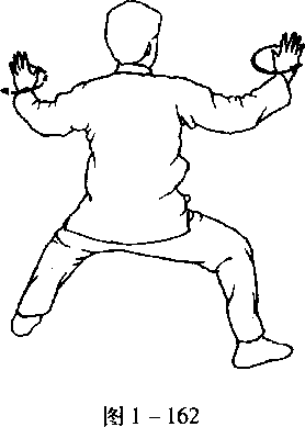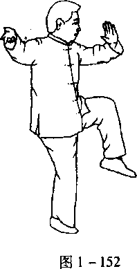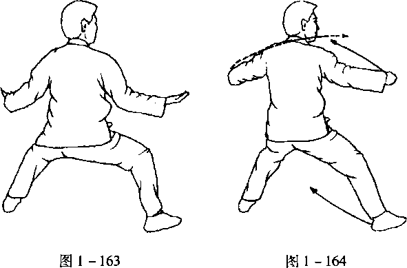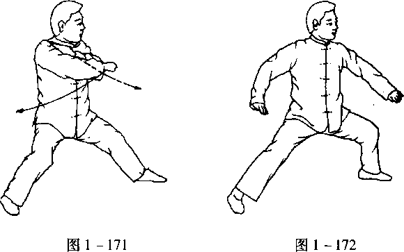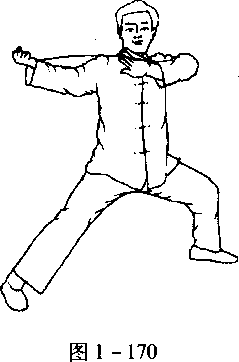 口令5(图1 - 171) 身体左转,重心右移,同时左掌经右侧向外划弧于右胸前,掌心向