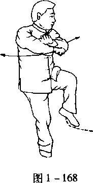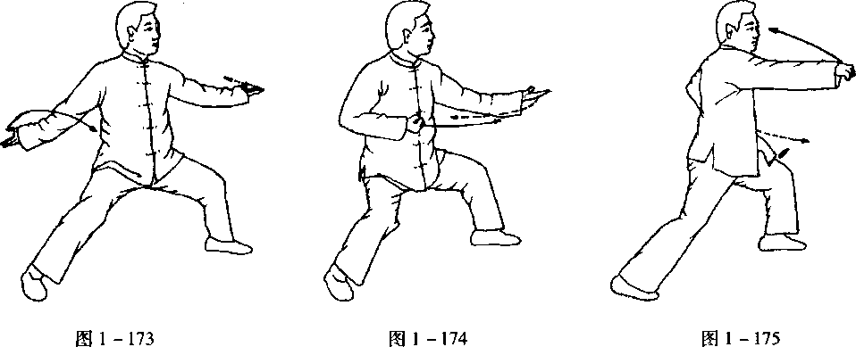口令4(图1 —170) 身体右转,重心左移,同时左肘后振,右拳拳心向上,向右横打。
