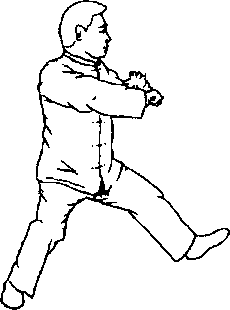 口令8(图1-175) 身体向左转,右腿蹬地,重心左移,同时左肘后振,右拳快速向体前