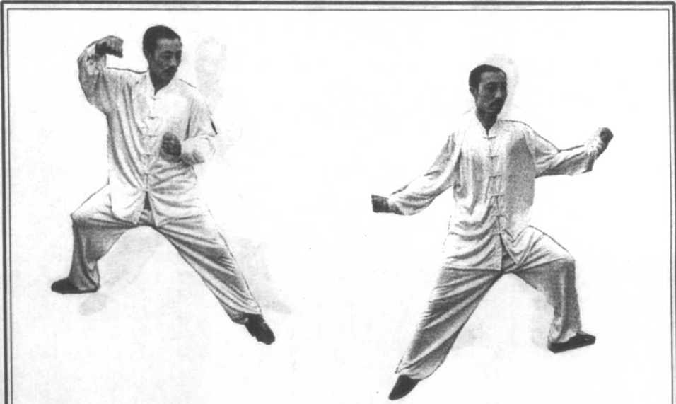 2. 重心继续右移,右手向右上旋转成拳,向右后 突然发出肘劲,同时左手在左下亦转腕成拳,与右拳