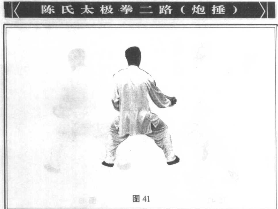 重心左移,身微左转成左弓步,左拳翻腕一顿,拳 心旋向上,突然一抖,向左前发出例劲,右拳同时外撑 与左拳相呼应,左拳为主,右拳为辅(图40)o