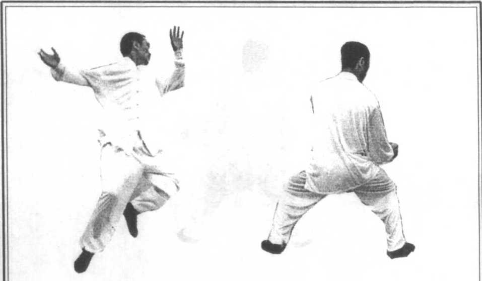 承上式左手左足同时上提,突然跃起,身体左转 (图42),此时面转向东南,紧接着转身,左足左手下 落,右掌亦同时弧形上扬,高过头顶,并向前下用掌缘 砍下,左手配合发出肘劲向左后击出(图43),整个跳 跃转身过程是左右两足前后交换了位置。