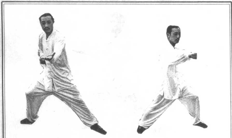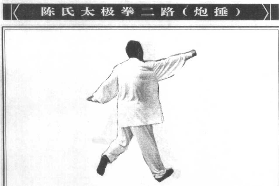 1. 身微右转,跃起身躯,双足在跳跃中,交换了前 后的位置,同时,右手自右向前向内划弧握拳回收于图45 图46胸前,拳心向上,接着身微右转,左手亦自左划弧绕至 胸前,手心向上,左手在前,右拳在后,前后合住劲(图 44、图 45)。2. 重心前移,身体左转,成左弓步,同时,左手旋 转后拉,由手心向上转为手心向下,搬拉至左肋旁,右 拳同时由胸前迅急旋转向前发出,由拳心向上,转为 拳心向下(图46)。要点1. 在二路拳中,不同的拳式多用“搬拦捶”连接,一路拳 中,不同的拳式则多用“单鞭”连接。图47