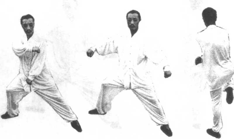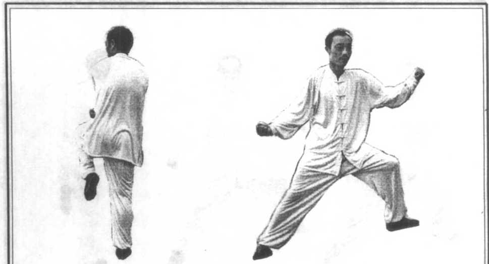 此式亦可提出单练,是内外双修的拳式。单腿独立带动身躯 旋转,要表现出既稳沉又灵活的势态。