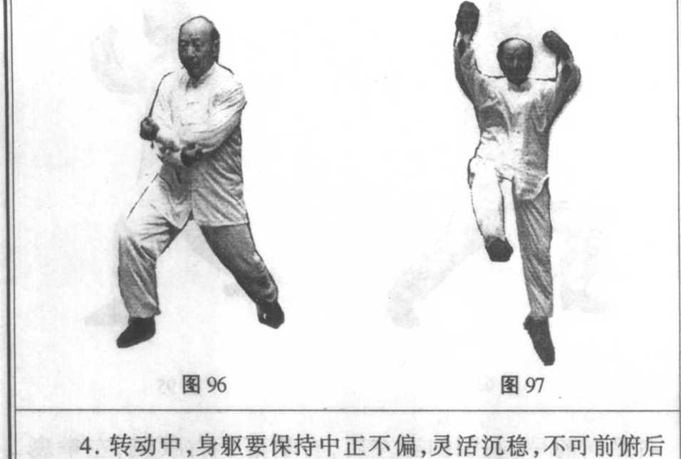 搬拦捶发劲后,身微右转,重心后移,右腿弓,左 腿伸直,右拳下落于右胯侧,拳心向上,左拳向上绕缠 于左颊前,拳心向内(图92)。接着身微左转,重心左 移,左腿微弓,左拳下落于左胯侧,拳心向上,右拳向 上绕缠于右颊前,拳心向内(图93)。上述动作,反复 做两次,将劲裹足(亦可多做一二次)。在第二次重心 左移,右拳回缠的同时,右足收回一震足,接着右足尖 向右外一撇转(足尖转向西南),带动身躯,提起左足 贴地蹲身转体360。,转至面向东时,双拳合住劲,此时