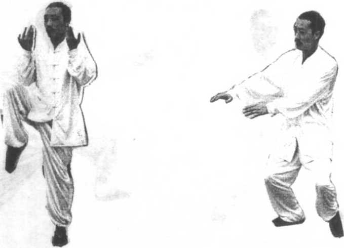 1 .重心先微左移随即右移,同时,两手在胸前成 顺时针方向划一圆弧,合于胸前,接着重心左移,右足 屈膝上提(图11、图12) o图13 图142. 左足下蹲,右足随即落地铲出(图13),重心前 移成右弓步,同时,两手翻腕下按,手心向下,身向右 转,左手贴身按于左腰上,右手向右转臂平行展开,手 臂微屈,不伸直(图14)。定式时,拧腰,扣裆,沉肘,右 手心向左,左手仍按于右腰部。要点此式着重练习左足单足起落、开合,掌握自身平衡的功 夫,在两手开合旋转中,要求做到圆活自如有合中寓开,开中 寓合之意。 — 图15 图16