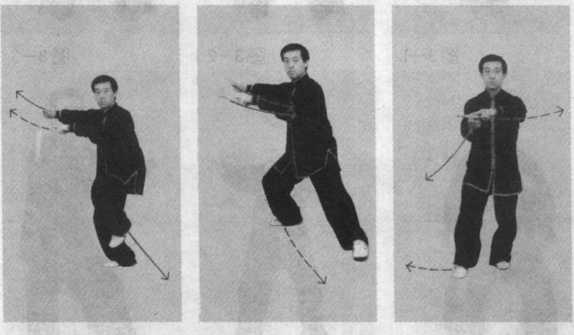 要求:跨步、转身、开右手均要结合腰劲。