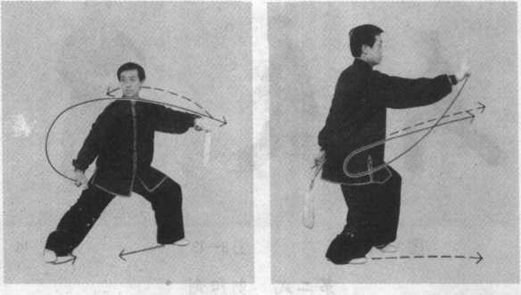 用法:左手持剑在对方面部一晃,内气贯于右手指前推, 直指对方眼睛,有“二龙戏珠”之意。