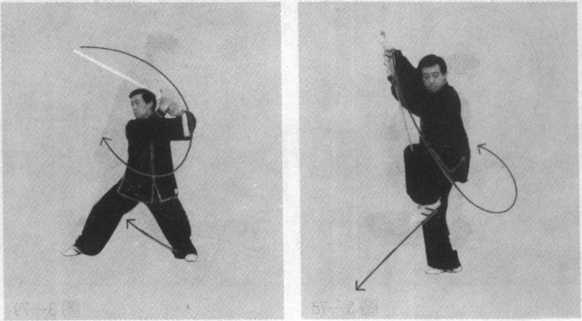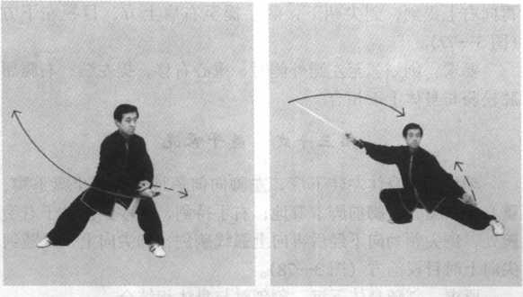 要求:重心左移,向右后撤步与身体微左转,剑下合引劲 要协调一致,开步要轻灵自然。