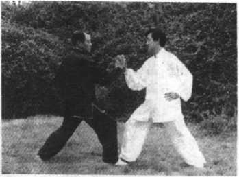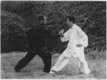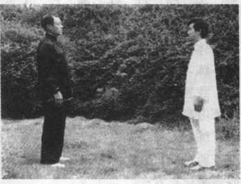 1 .单手挽花:甲(穿白衣者)、乙(穿黑衣者)双方搭手 前相对站立,其距离以双臂握拳向前平伸拳顶相触为标准
