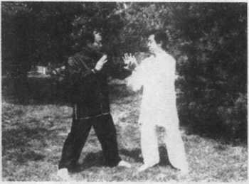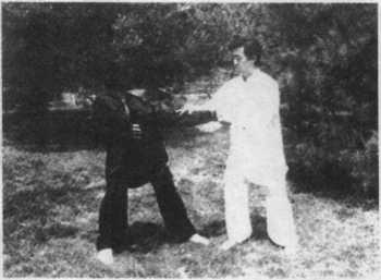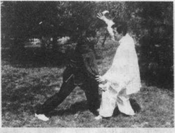 1 图 6—15.乙方左手顺步 击甲,甲左手接住乙 左手腕,右手随之搭 于乙左小臂,双手在 向前滚动加搠劲的同 时,左手向下拿住乙 手掌,右手向上粘住 乙肘关节,双手突然 向前下略偏内合劲, 使乙方左臂突然受制 以致身体前倾(图 6--15、图 6—16)o