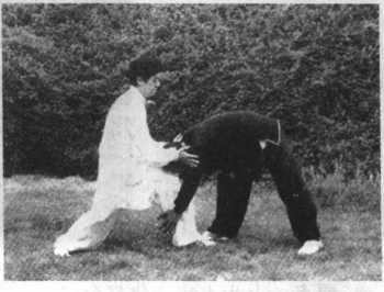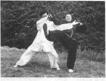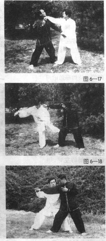 左腿在前,可直插其 裆内),左手穿于其 右腋下,重心左移, 身向左转将乙发出 (图 6—19、图 6— 20) o