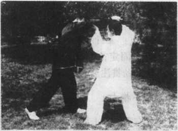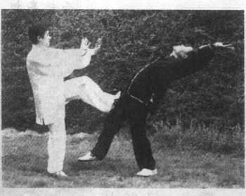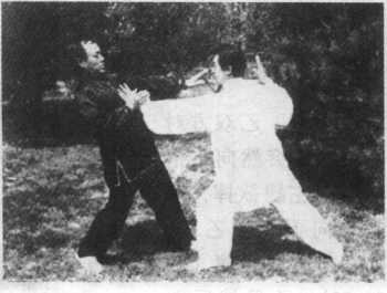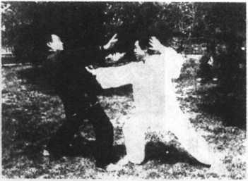 2 图 6—24.乙方身向前 倾,欲后抽找重心维 持平衡,甲方双手随 之向前送乙,并出左 脚蹬之(图6—24)。