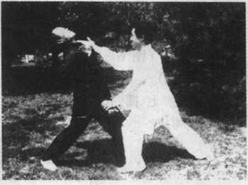 图 6—25乙方顺步,用左 手击甲方胸部。甲方 身体略向右转,同时 出右手由内向外援 带,用小指侧面将乙 方左手攻势化解。随 即甲方上左步,出左 掌推击乙方胸部(图 6—25)O如果乙方顺 步用右手击甲方胸 部,甲方化解和攻击 动作与以上动作相 同,惟方向相反(图 6—26) o