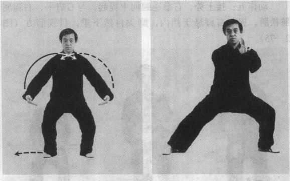 要求:两手上撩划弧交叉时,与开右步同时进行,协调一 致。腰劲下煞,裆要开圆。此动为下开上合,吸气。