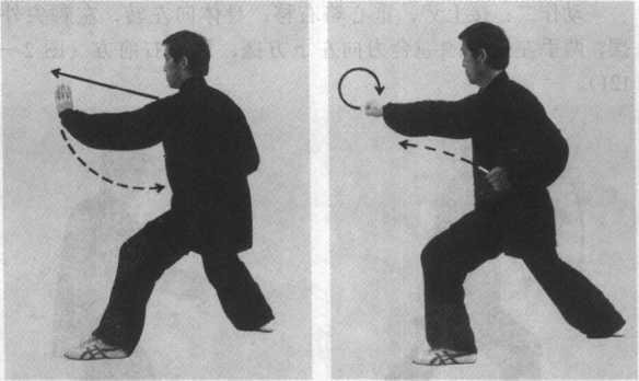 内劲:丹田劲沉于右脚,再由右脚蹬地发出,顺右腿里缠 至左腿,腰劲迅速左转,上缠至右肩肘,再逆缠达右拳顶;左 肘辅助发劲,使周身完整一气。