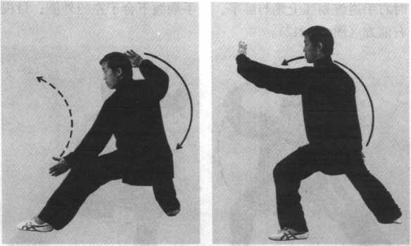 要求:右手上搠时以裆催腰,以腰催肩肘达于手臂,一气 贯通。此动吸气。