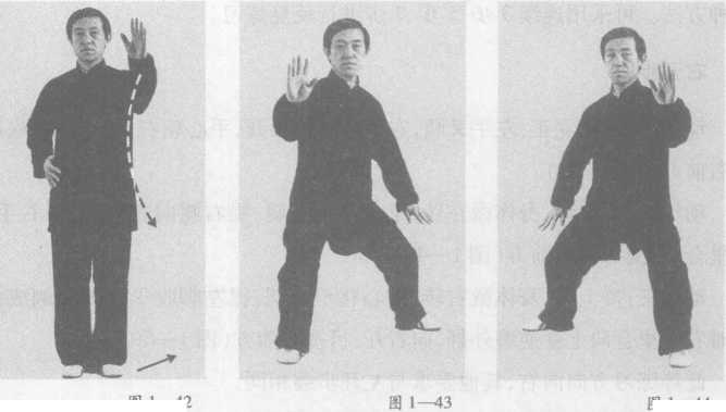 动作二:接上势,身体微左转,重心移至左腿,提右腿向右侧开步,右手走下 弧里合;目视身体右前方(图1—9)。