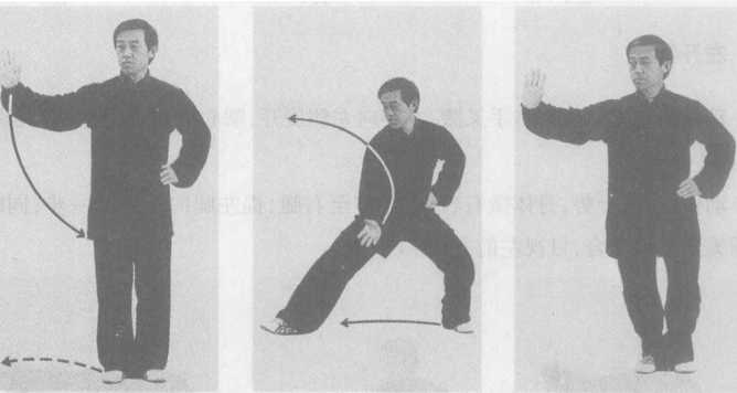 此势主要是练习左开步及左手单臂缠绕,脚开手合,手合脚开及上引下进的 一种方法。可采用连续3步、5步、7步进行反复练习。
