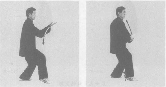 要求:身体先动,松左胯,移重心走弧线,两臂搠劲不丢。此动呼气。