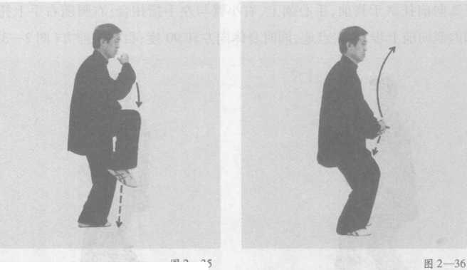 动作六:接上势,身体下沉,右拳逆缠向上提起略比右肩高;右腿屈膝提起, 右脚放松悬于裆内;左手略顺缠下沉,手心朝上;目视前方(图2—35)。