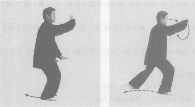 要求:向后退步时眼观前方,耳听身后,步法轻灵,身法中正。此动先呼气后 吸气。