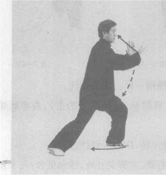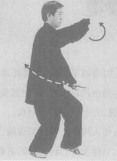 内劲:劲由腰脊右转,重心移于右腿,劲上缠于两肩胛,过肩肘贯于两手,周 身放松,下沉合劲复归丹田。