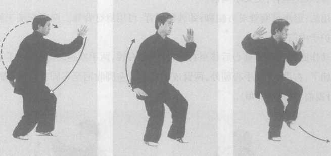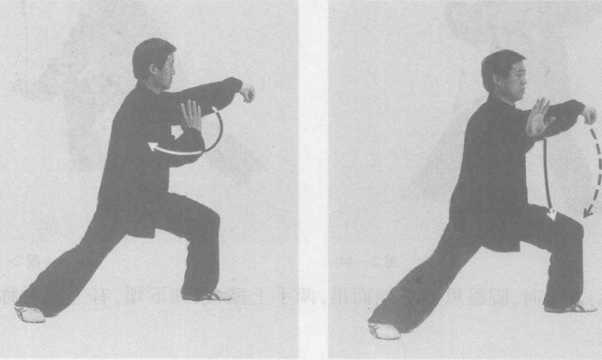 内劲:劲由丹田发出,由腰缠至右肩,过肩肘至手(以右手为主),右手顺缠 在面前划弧,左手逆缠向后划弧。