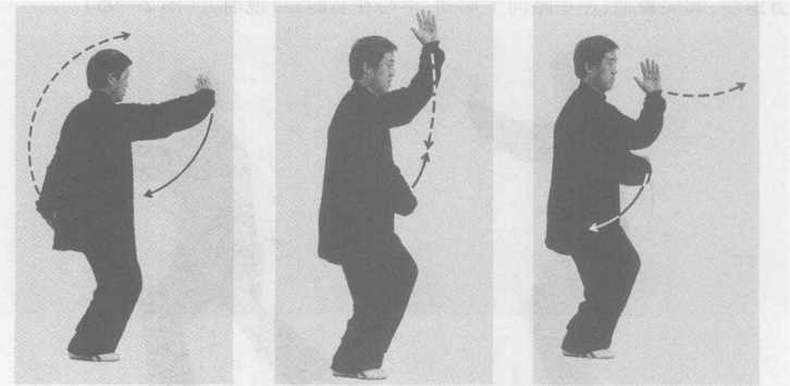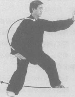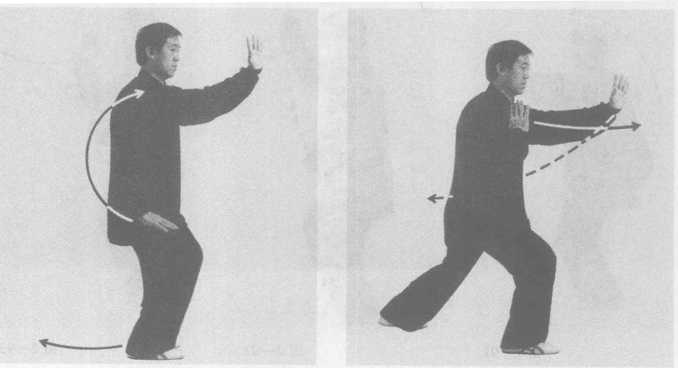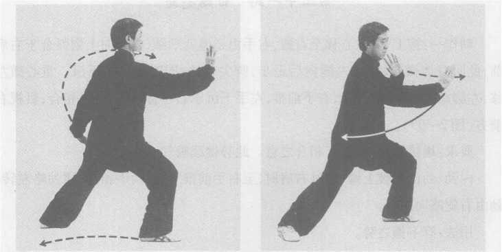 内劲:以腰为轴,劲由右腿移至左腿,随腰左转,缠至左肩、肘、手,再逆缠后 振,右手逆缠前推。