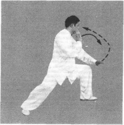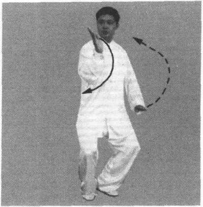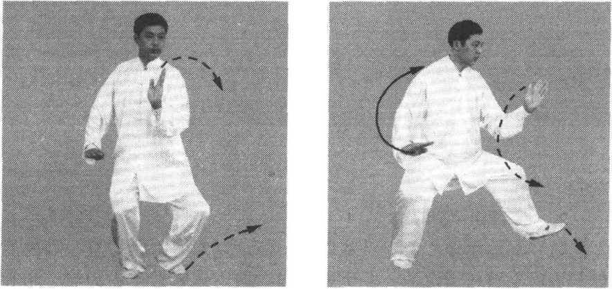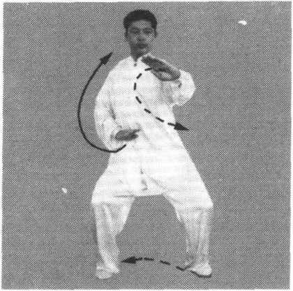 (1) 身体左转,右腿弓膝塌劲,随之左脚向内收转至右脚内后 侧。同时左臂松肩沉肘,左手逆缠向内向下划弧转至左胯前,掌心 向下,掌指向前,右手逆缠向右向上划弧转至肩高,变顺缠屈肘至 右肩前,掌心斜向左,掌指斜向上。眼看右前方(图5-13)。
