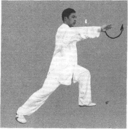 (2) 身体变为右转,右手逆缠向内向下划弧转至右胯前,掌心