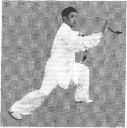 向下,掌指向前,左手逆缠向左向上划弧转至肩高,变顺缠屈肘向 内收转至左胸前,掌心斜向右,掌指斜向上;接着,提起左脚,以 脚跟内侧贴地,向左前方擦出,脚跟着地,脚尖翘起;同时,左肘 不动,左手加大顺缠,掌心斜向前,掌指斜向左前上方,眼看左前 方(图 5-14、15)0