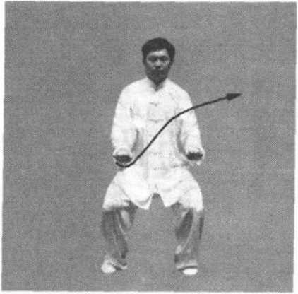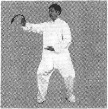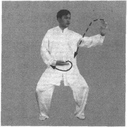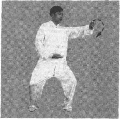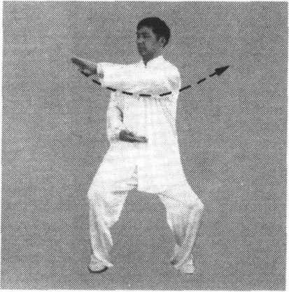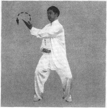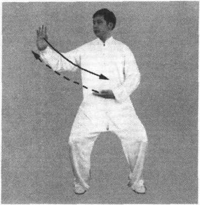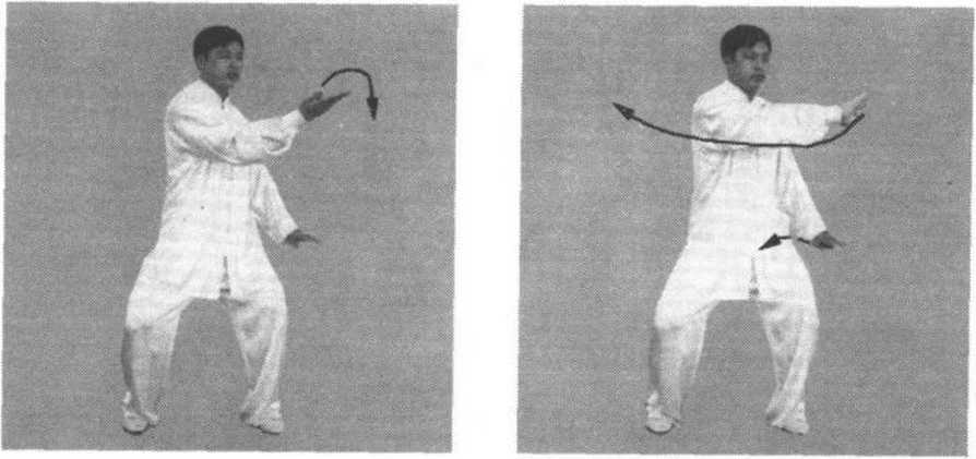 ③ 右手向下至腹前,同时,左手顺缠向右前上方穿出,掌心向 上,掌指斜向右前方;接着,手变逆缠向内划弧,掌心翻向外;同 时,身体左转,手向左划孤平云转至左侧前方,手变顺缠,松肩沉