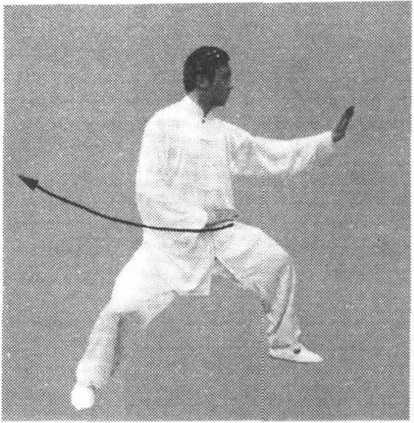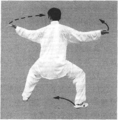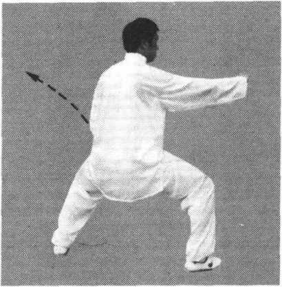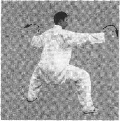 (3)身体继续右转,右脚尖划地向右后方撤步,弓膝塌劲,左 脚以脚跟为轴,脚尖向内扣转,成马步。左手逆缠向前落至右臂上 侧,向前转出,手同肩高,掌心斜向前下方,掌指斜向前上方,右 ?204.