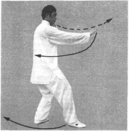 要 点:右脚向后撤步时,脚尖划地向内经左脚内侧,向右后 方撤步;撤步的路线是脚划一半圆,缺口向外。左右相同。