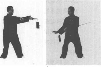 (5)前动不停,右腿屈膝提起,同时,左手持剑 屈臂内合,手心向前下方,将剑横于胸前,剑尖向左; 右手剑指顺缠,向下、向前、向上划弧撩摆,置于左 手下方,右腕轻贴剑柄,手心向上,指尖向前下方; 目随右手。(图2-2-8)