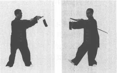 (2)前动不停,身体稍左转,两 手(右手剑指顺缠)向左前方上撅至 左肩前;接着,左脚内扣,重心左 移,右脚尖上翘;身体右转,右脚以 脚跟为轴,脚尖外摆(胸向西南); 两手(右手剑指逆缠)随体转向右平 摆,目视前方。(图2-2-3、图2- 2-4)