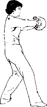 (3) 上动不停,两拳以腕相 贴的交叉点为轴,同时内旋向 里,向下、向前绕一小圆后变掌 外撑,掌心朝外。目视两掌方 向。